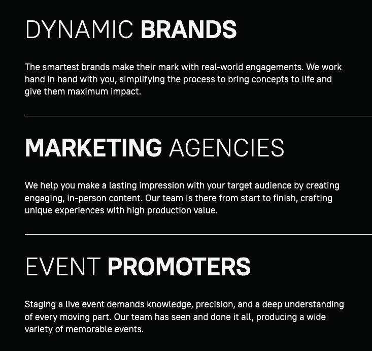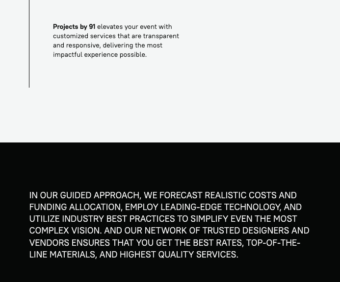 I like working with dynamic entrepreneurs and the ProjectsBy91 team fits that description to a tee. They are no-nonsense doers with a clear vision who needed concise, straightforward copy that established bona fides and set the tone for their live event production company.